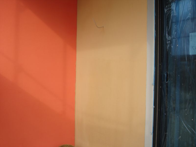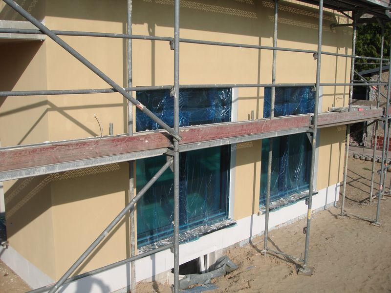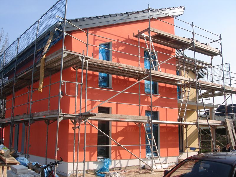 Wir haben ein paar Tage frei und konnten daher heute schon die erste fertig verputzte Außenwand in Augenschein nehmen. Der erste Probeanstrich auf einer Styroporplatte hat uns nicht so überzeugt. Wir wollten exakt die Farben Gelb und Rot des Musterhauses, daher hat der Malerchef die Farbe mit einem Scanner eingescannt und danach bestellt. Das Gelb ist schön, aber die Putzgrundierung für den roten Teil der Fassade, die schon letzte Woche angebracht wurde, sieht deutlich heller als der Wunschfarbton aus. Okay dachten wir, der Putz hat vielleicht die endgültige, gewünschte Farbe. Heute nun die Erkenntnis, dass auch der Rotton des Putzes heller ist als gewünscht. Wir sind extra mit einem Farbklecks heute Nachmittag noch mal zum Musterhaus gefahren, um zu vergleichen.