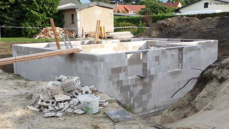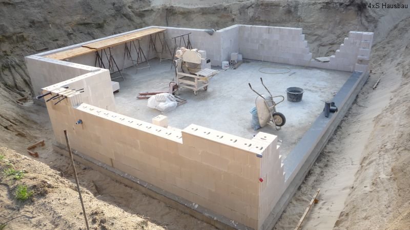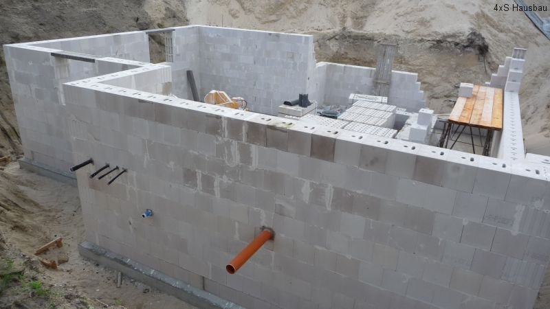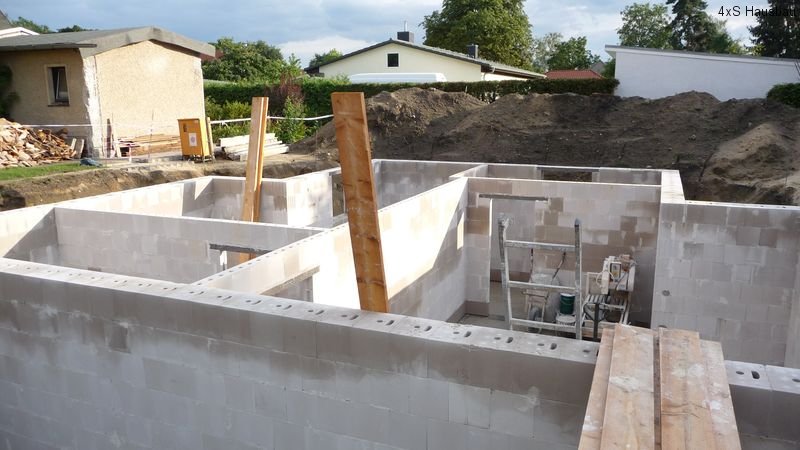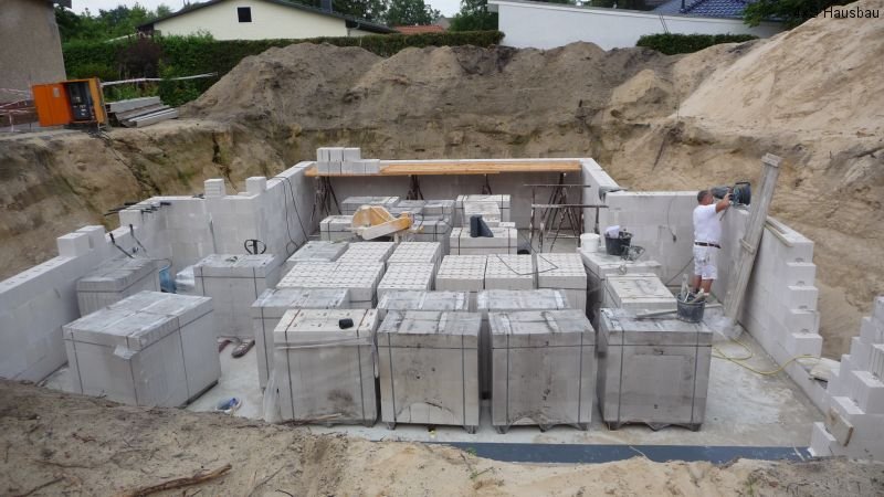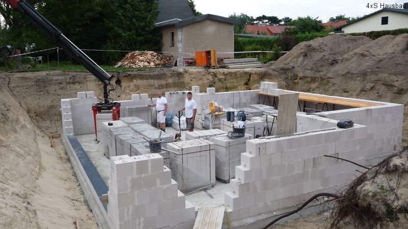 In dieser Woche sollte es dann mit dem Fundament für den Keller losgehen. Nachdem am Montag die Feinabsteckung erfolgte, die Hausecken fixiert waren und alles bereit war, musste aber nochmal innegehalten werden: Bei der Berechnung der Aushubtiefe kam es zu einem Fehler – es hätte 21 cm tiefer ausgebaggert werden müssen. Ein Malheur, was zum Glück rechtzeitig bemerkt wurde. Also rückte am nächsten Tag nochmal der Bagger an, allerdings war es nun ungleich schwieriger den märkischen Sand aus der Grube zu befördern. Baggerfahrer Jörg, ein Bekannter von Susanns Eltern, buddelte mit Feinschliff noch tiefer aus – die Sandhaufen auf dem Grundstück wuchsen weiter in die Höhe.