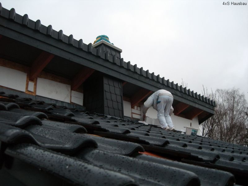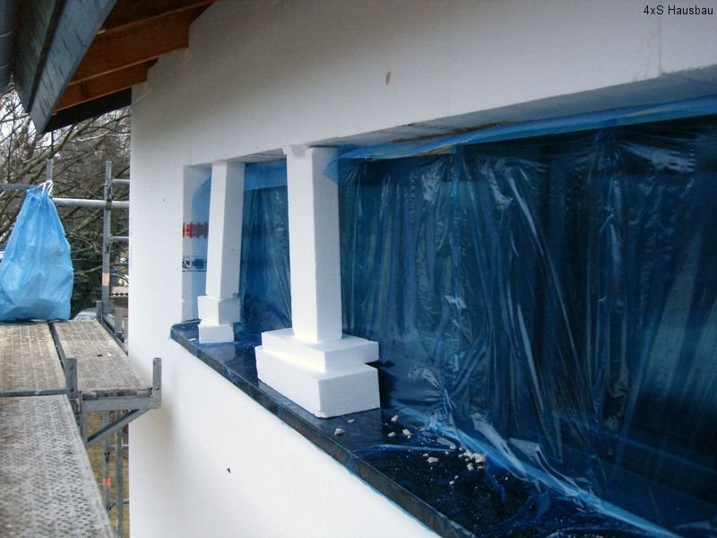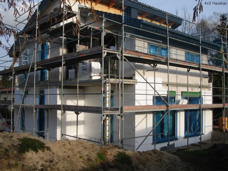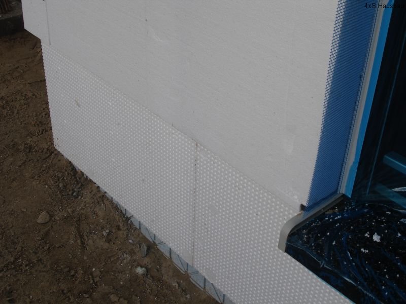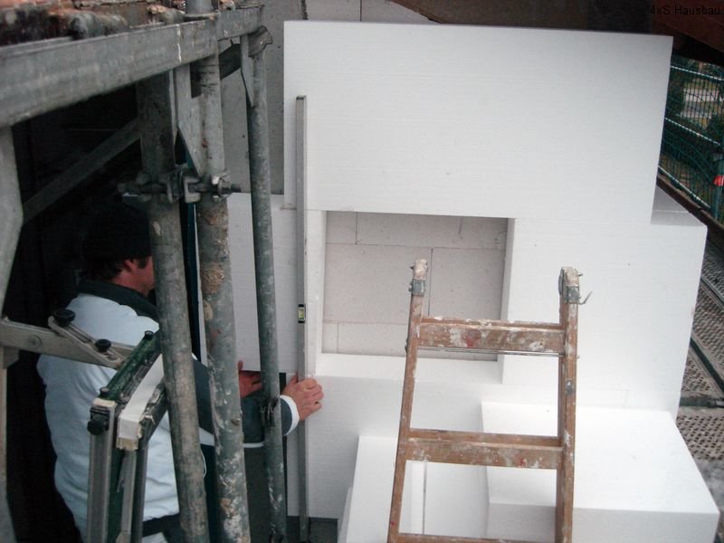 Seit Dienstag sind die Heizungs- und Sanitärmonteure (bzw. seit Donnerstag nur noch einer von ihnen) mit dem Verlegen der Fußbodendämmung im Haus beschäftigt. Dazu müssen die Dämmplatten passend zugeschnitten und für die schon liegenden Elektrokabel ausgeschlitzt werden. Ebenso wurden die Heizkreisverteiler in allen Etagen angebaut sowie die Heizungs- und Wasserrohre verlegt. Auch die Montageelemente für die WCs und Waschtische wurden angebaut. Auch hier wurden wieder neue Löcher und Schlitze in die Wände gestemmt. Leider hat darunter an einer Stelle der Putz gelitten – hier müssen die Maler also später ran, um den Schaden zu beseitigen.
